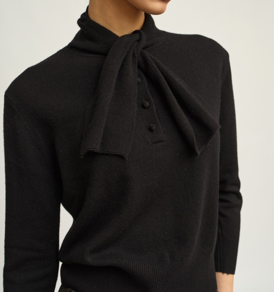 Etta is distinctly feminine take on a classic cashmere top Etta features a slim fit velvet buttons and a large tie like toe at the front. Can be worn with your favourite high waisted trouser or skirt and works perfectly to update a winter evening look.