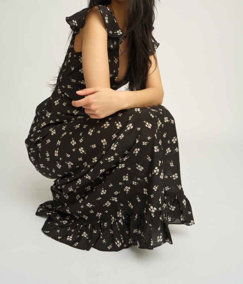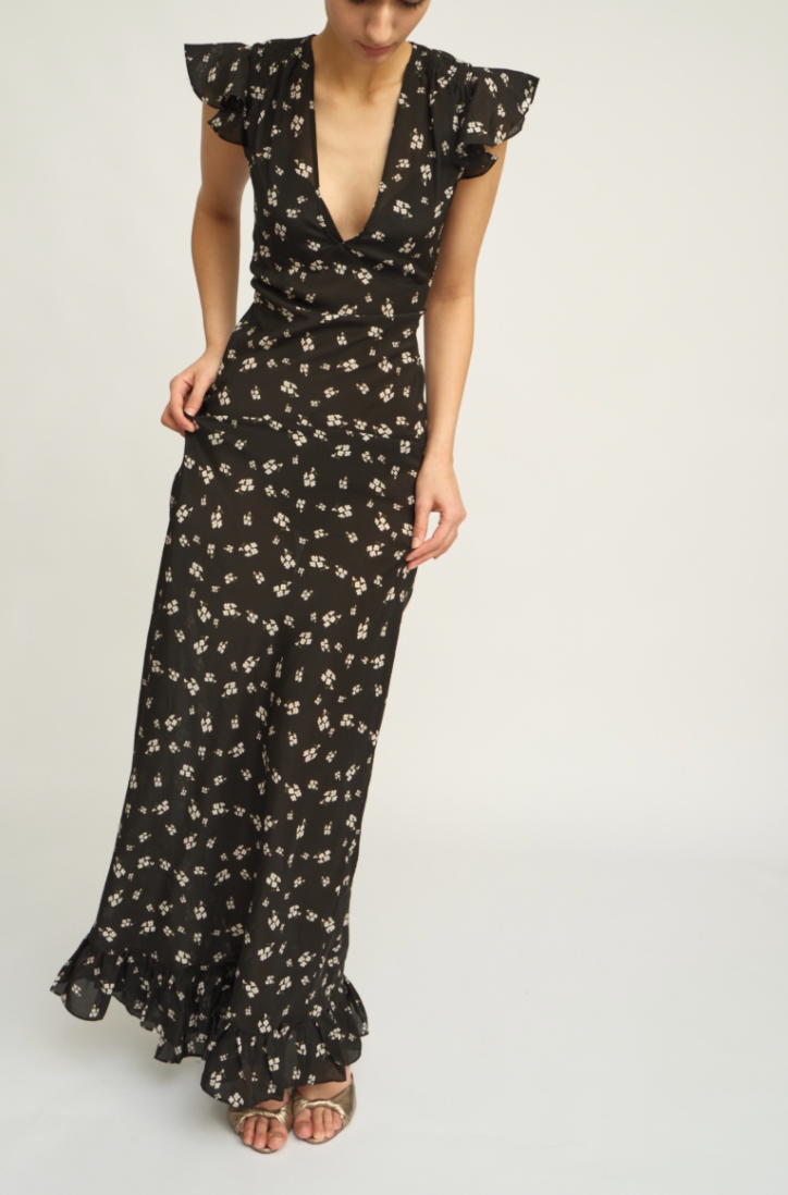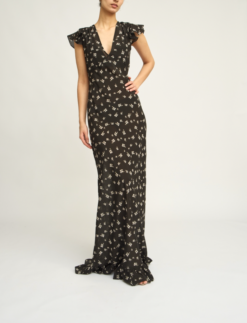 Nina is our latest floor length silk gown. Romantic and dramatic at the same time, its formfitting bodice features a deep v shaped neckline and flutter sleeves. Nina features a wide ruffle at the hem for fluidity and elegance. The dress is cut on the bias to bring a form fitting silhouette. Nina is made form 100% fine silk chiffon.